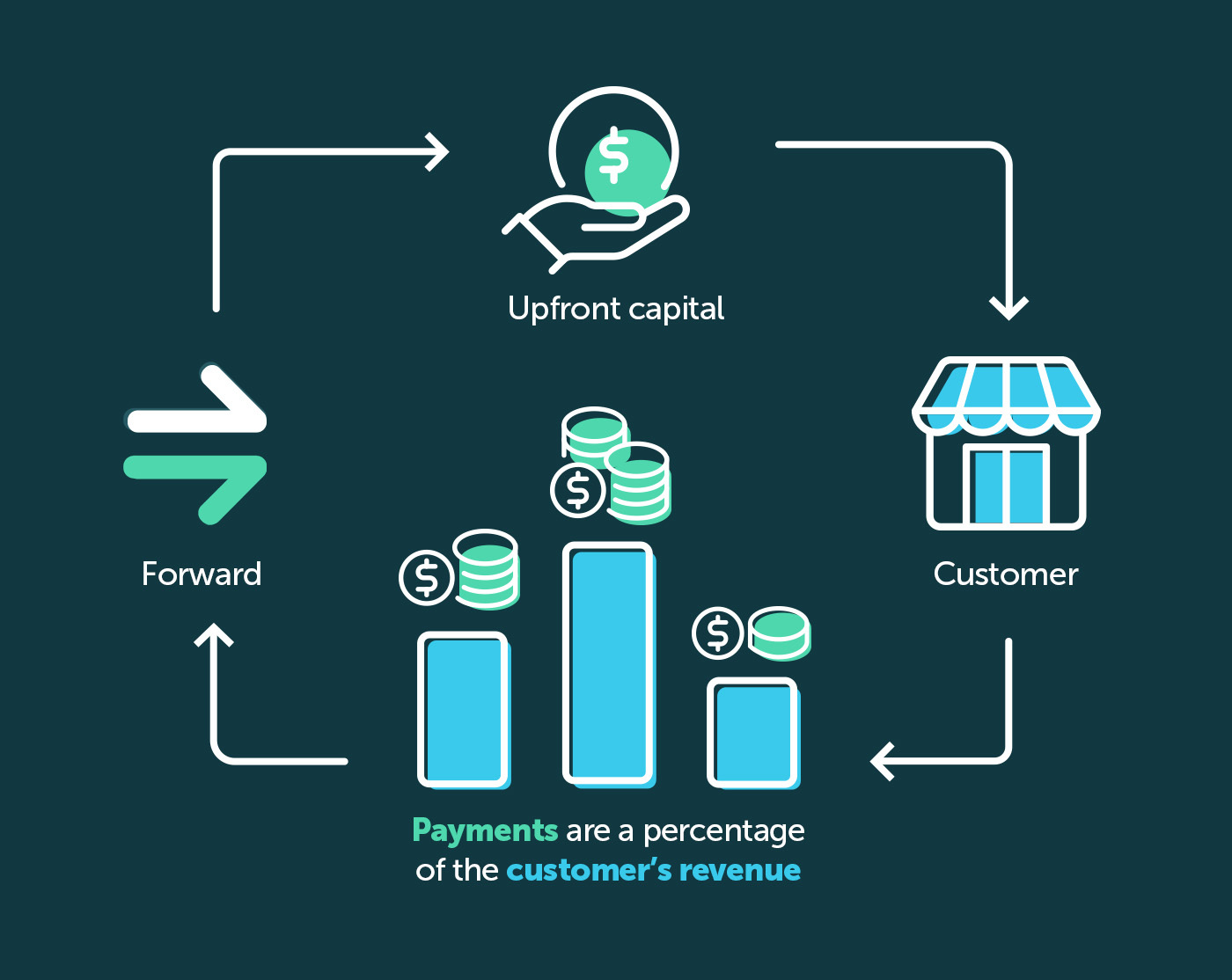 Within one week of receiving their capital, payments will begin automatically withdrawing from the customer’s business bank account. If business revenue decreases, payments can be decreased too. So customers are encouraged to reach out if things get tough. We may be able to help.